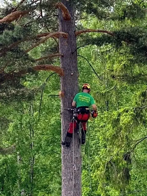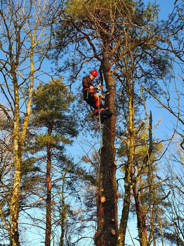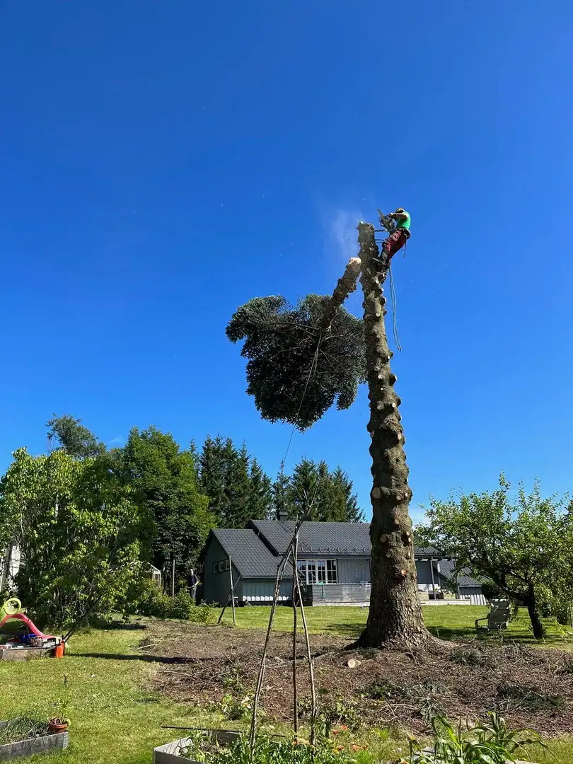 Er det trangt, treet står nær bygg, strøm, vei eller hageanlegg, tar vi det ned kontrollert i mindre deler. Da klatrer vi, sikrer og firer ned bitene for å unngå skader.